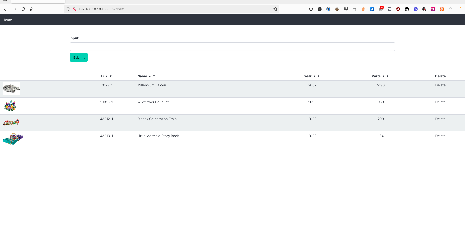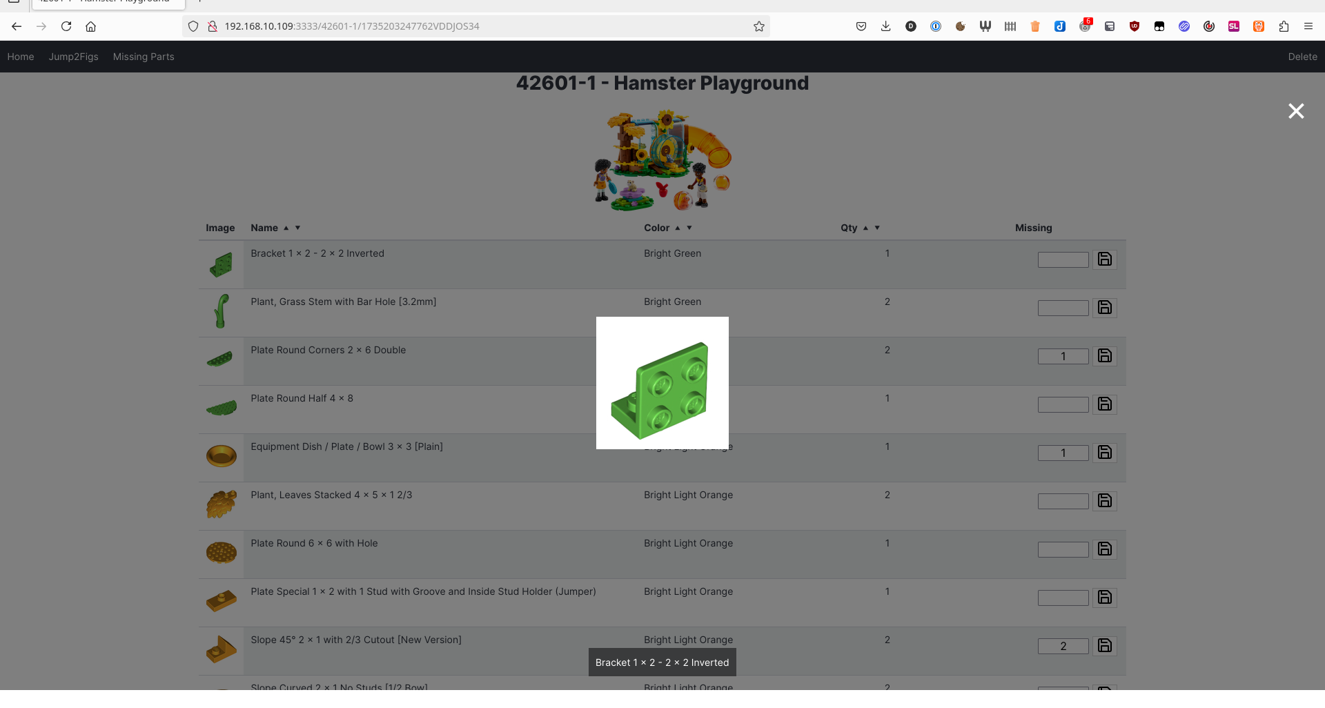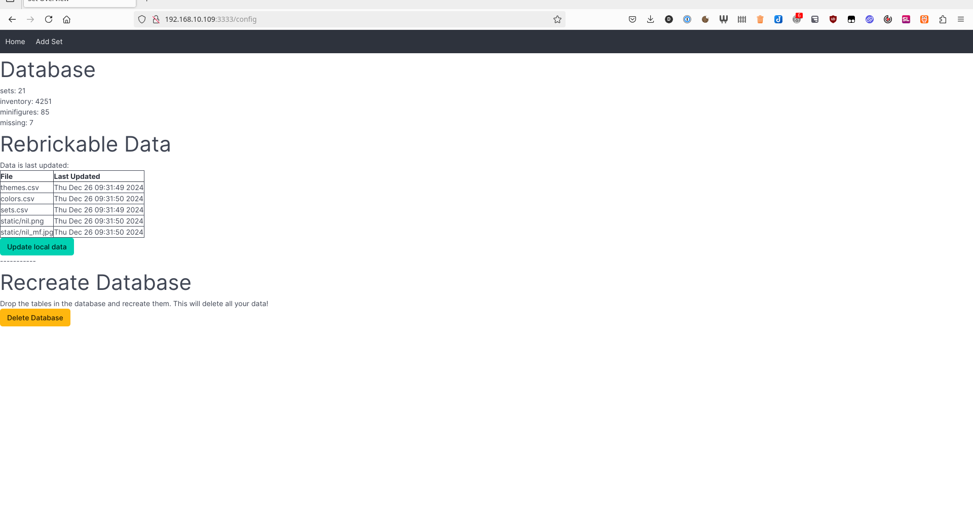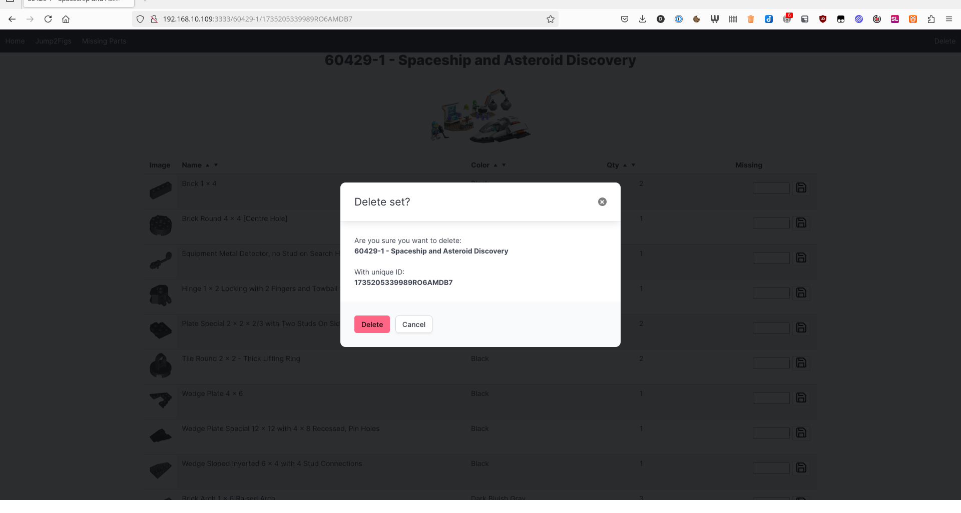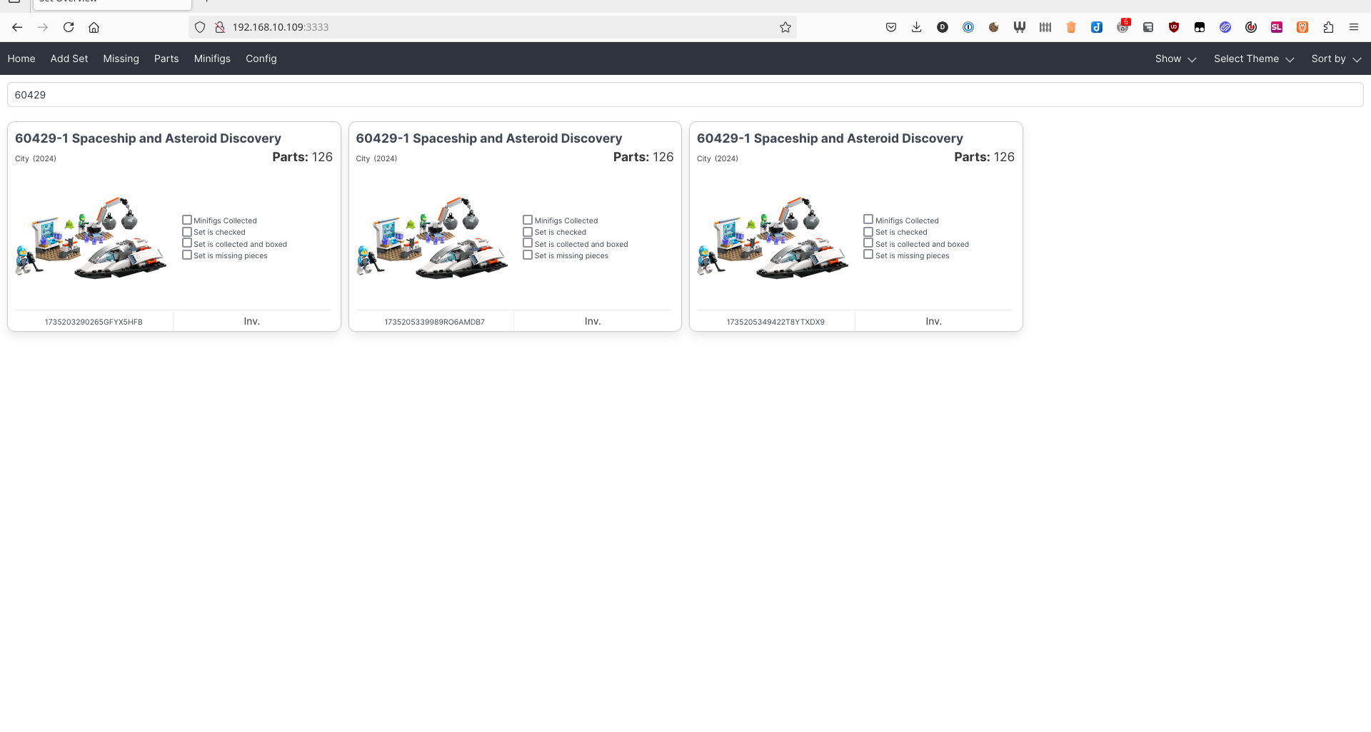 Sets are added from rebrickable and again checked against sets.csv. If you can't add a brand new set, consider updating your data from the /config page. Press the delete button to remove a set. Known Issue: If multiple sets of the same number is added, they will all be deleted.