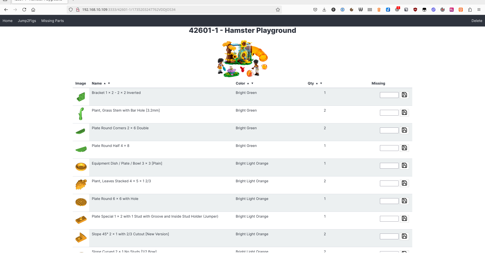List of all your missing pieces, with links to bricklink and rebrickable.
