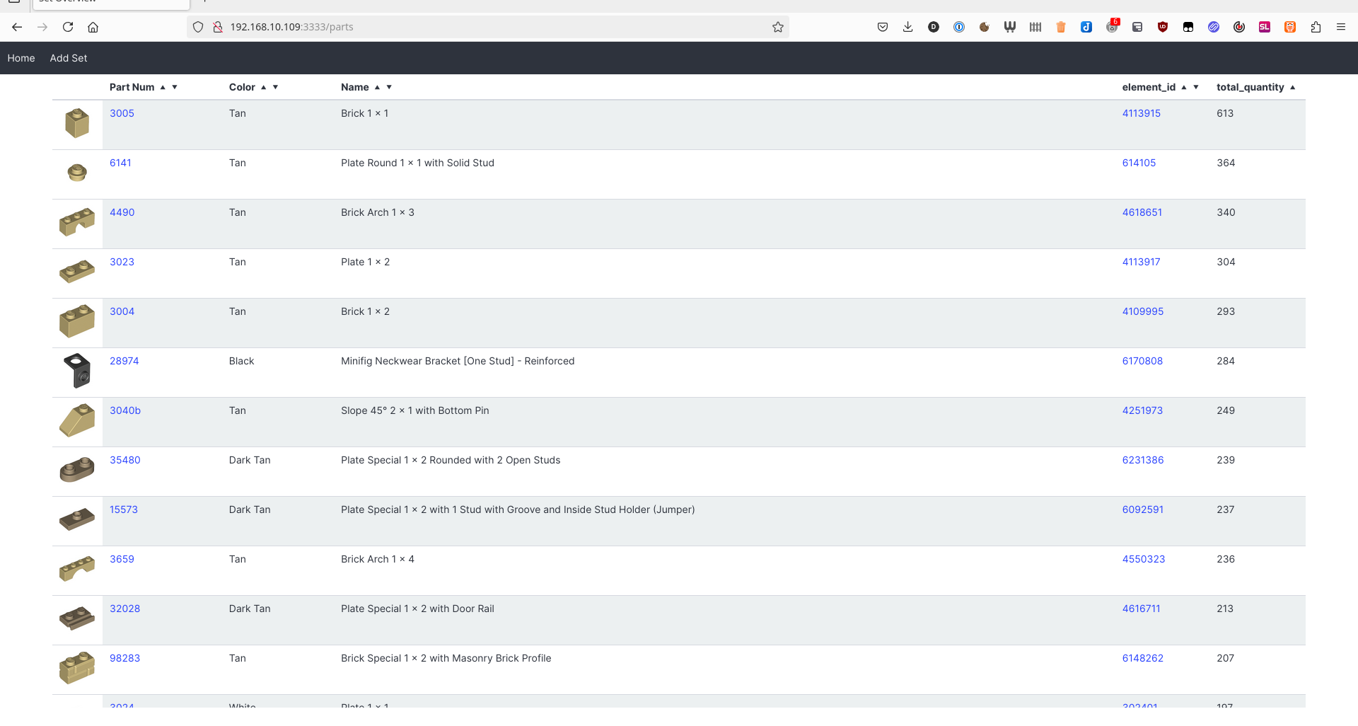 Sets are added from rebrickable using your own API key. Set numbers are checked against sets.csv from rebrickable and can be updated from the config page. When a set is added, all images from rebrickable are downloaded and stored locally, so if multiple sets contains the same part/color, only one image is downloaded and stored. This also make no calls to rebrickable when just browsing and using the site. Only time rebrickable to used it when up adding a new set.