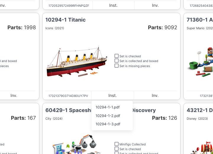 Search your inventory and sort by theme, year, parts, id, name or sort by missing pieces. If you download instructions as PDF, add them to a specific folder and they show up under each set