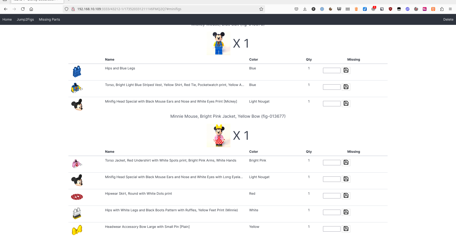 Filter by color, quantity, name. Add if a piece is missing. Press images to show them. Filter by only missing pieces. Minifigures and their parts are listed at the end.