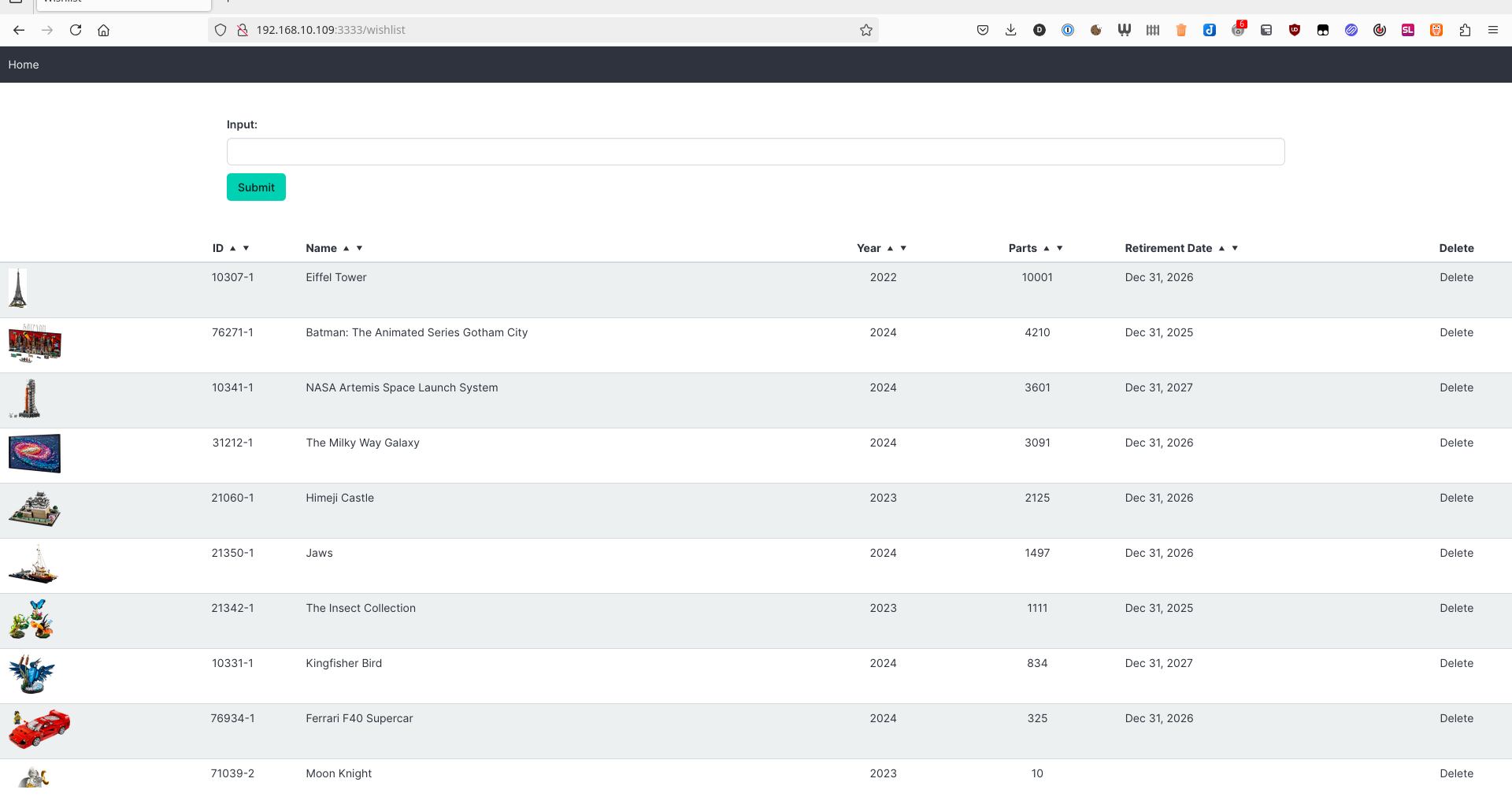 Sets are added from rebrickable and again checked against sets.csv. If you can't add a brand new set, consider updating your data from the /config page. Press the delete button to remove a set. Known Issue: If multiple sets of the same number is added, they will all be deleted.